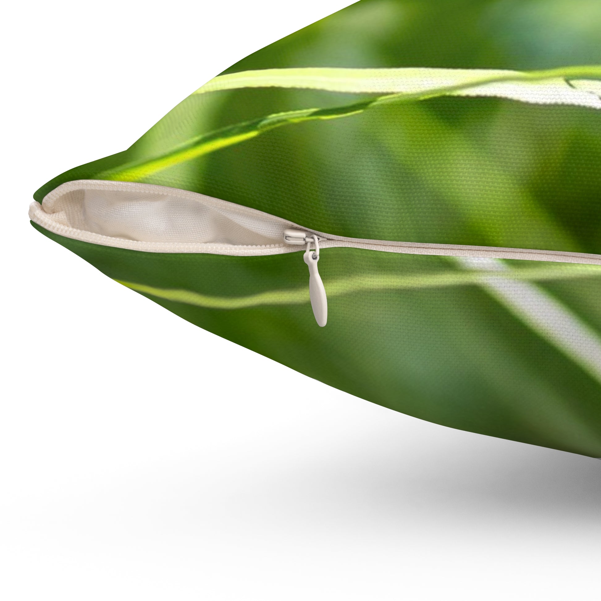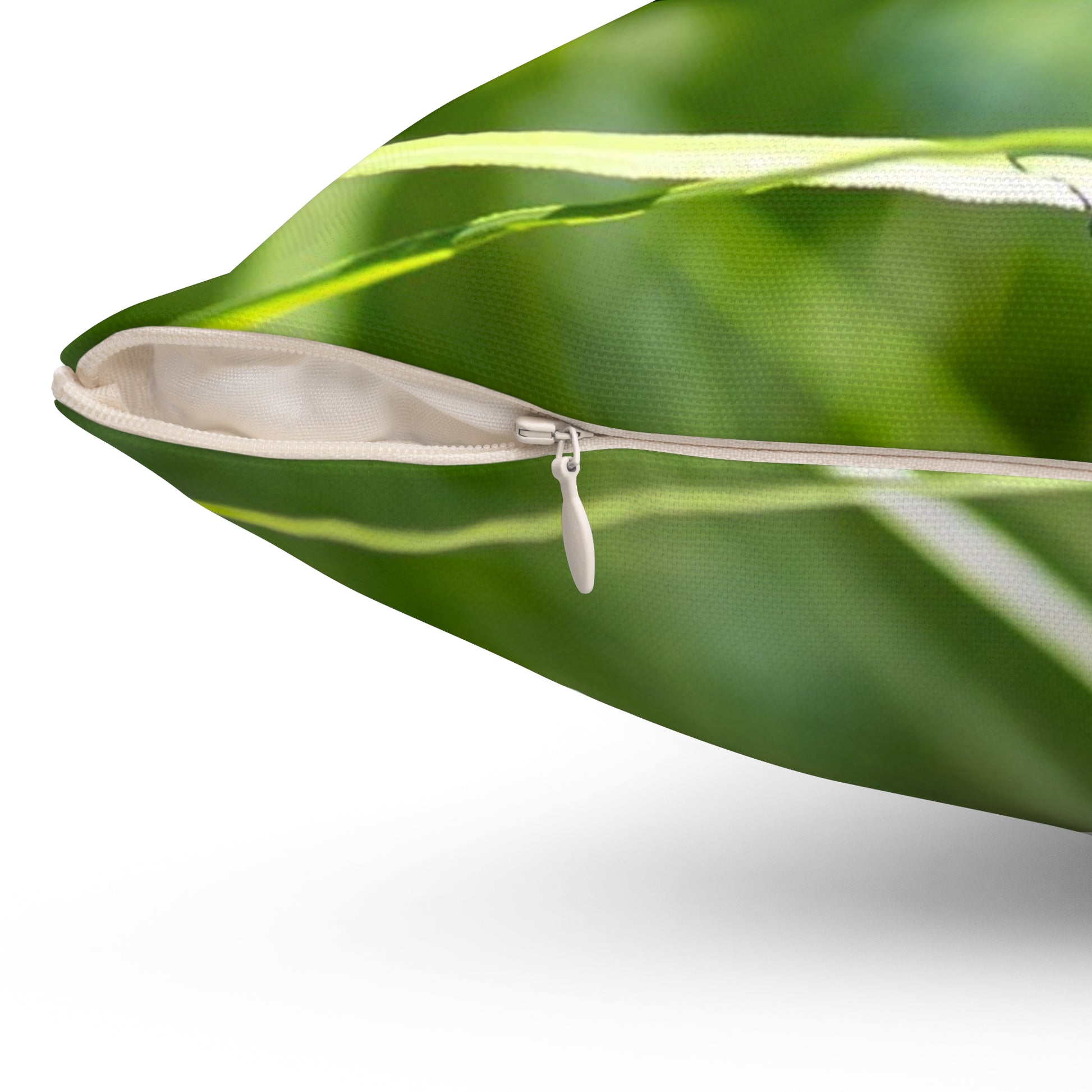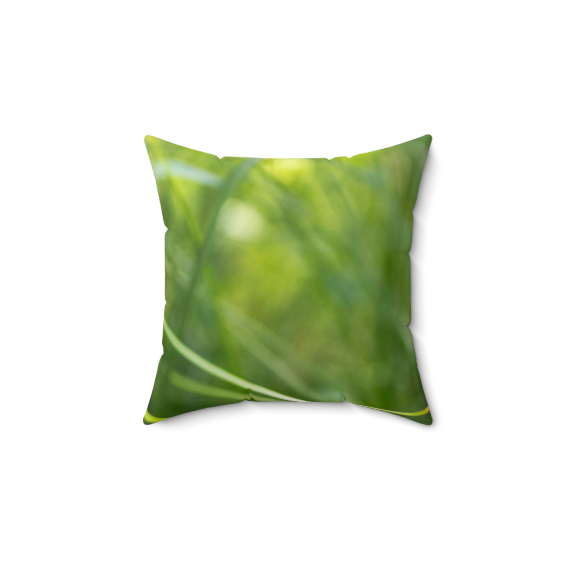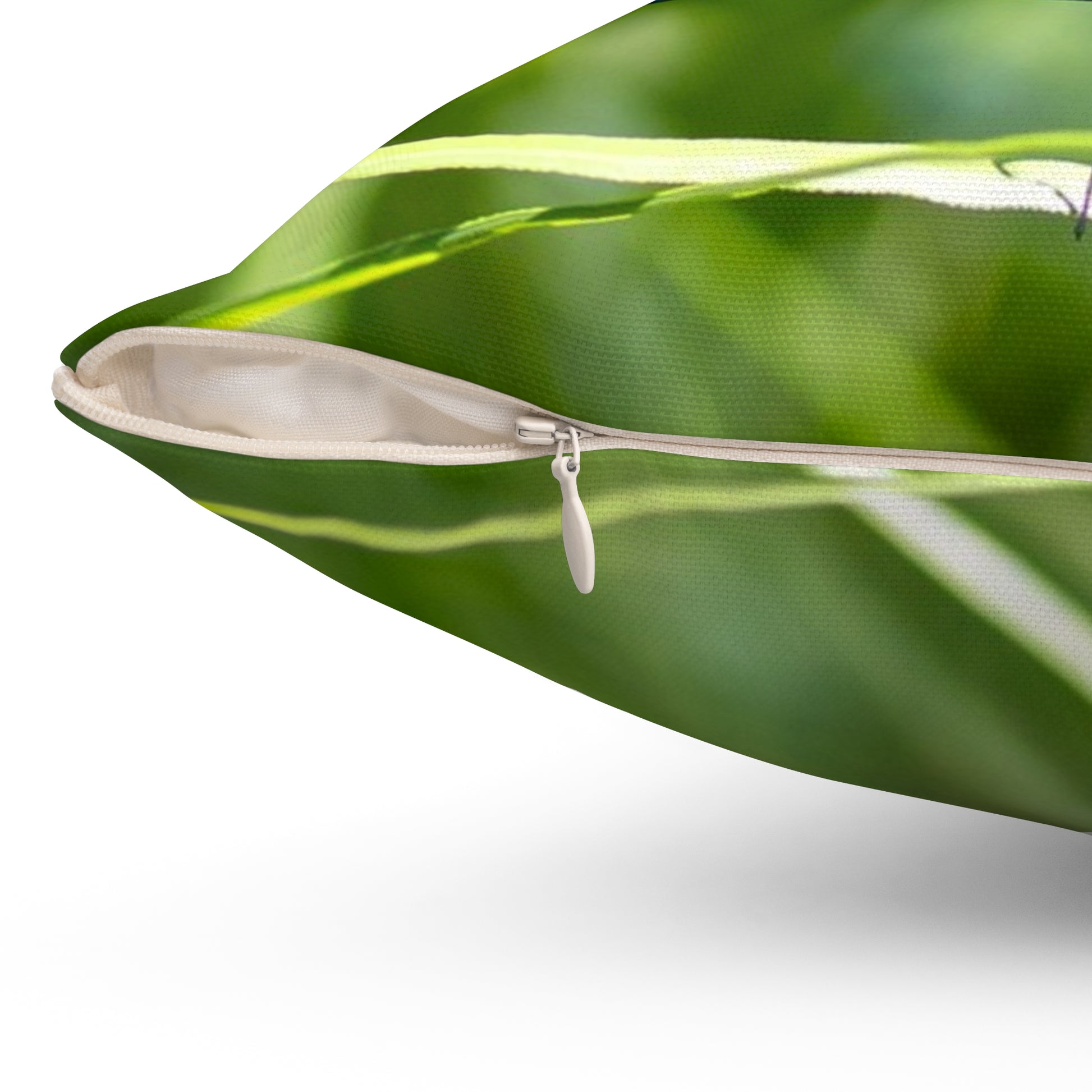 Bring a quiet moment of nature into your favorite nook with this square spun polyester pillow. A delicate damselfly rests on a slender blade of grass against a soft, verdant blur—an image that invites you to slow down and listen to the hush of meadow afternoons. The double-sided print keeps the palette of fresh greens consistent on both sides, while the concealed beige zipper keeps the silhouette clean. Light, resilient, and slightly plumped by an oversized recycled-poly insert, this pillow layers easily on a reading chair, windowsill bench, or outdoor-covered porch to evoke peaceful summer hours and gentle, slow-motion encounters with wildlife.