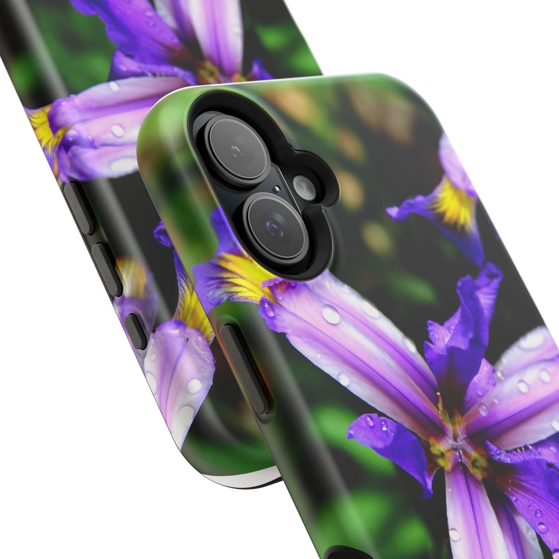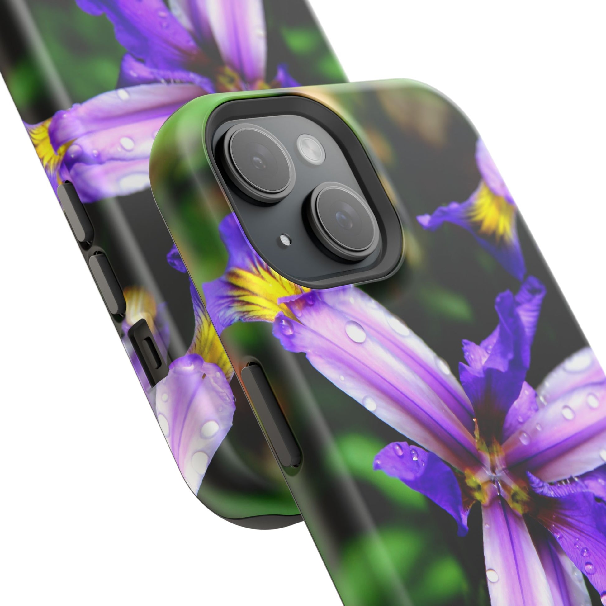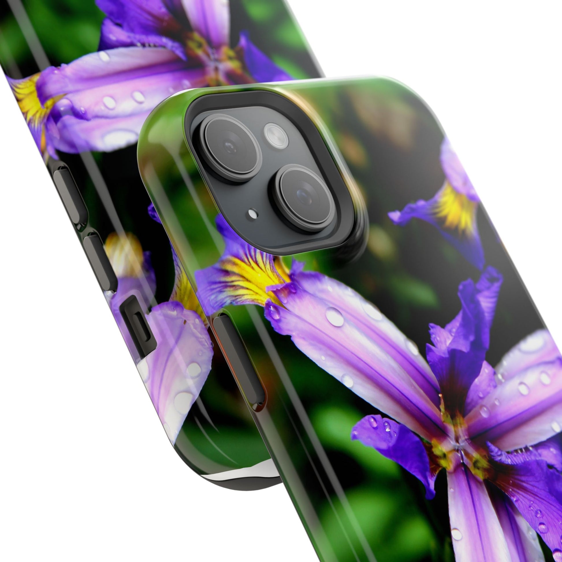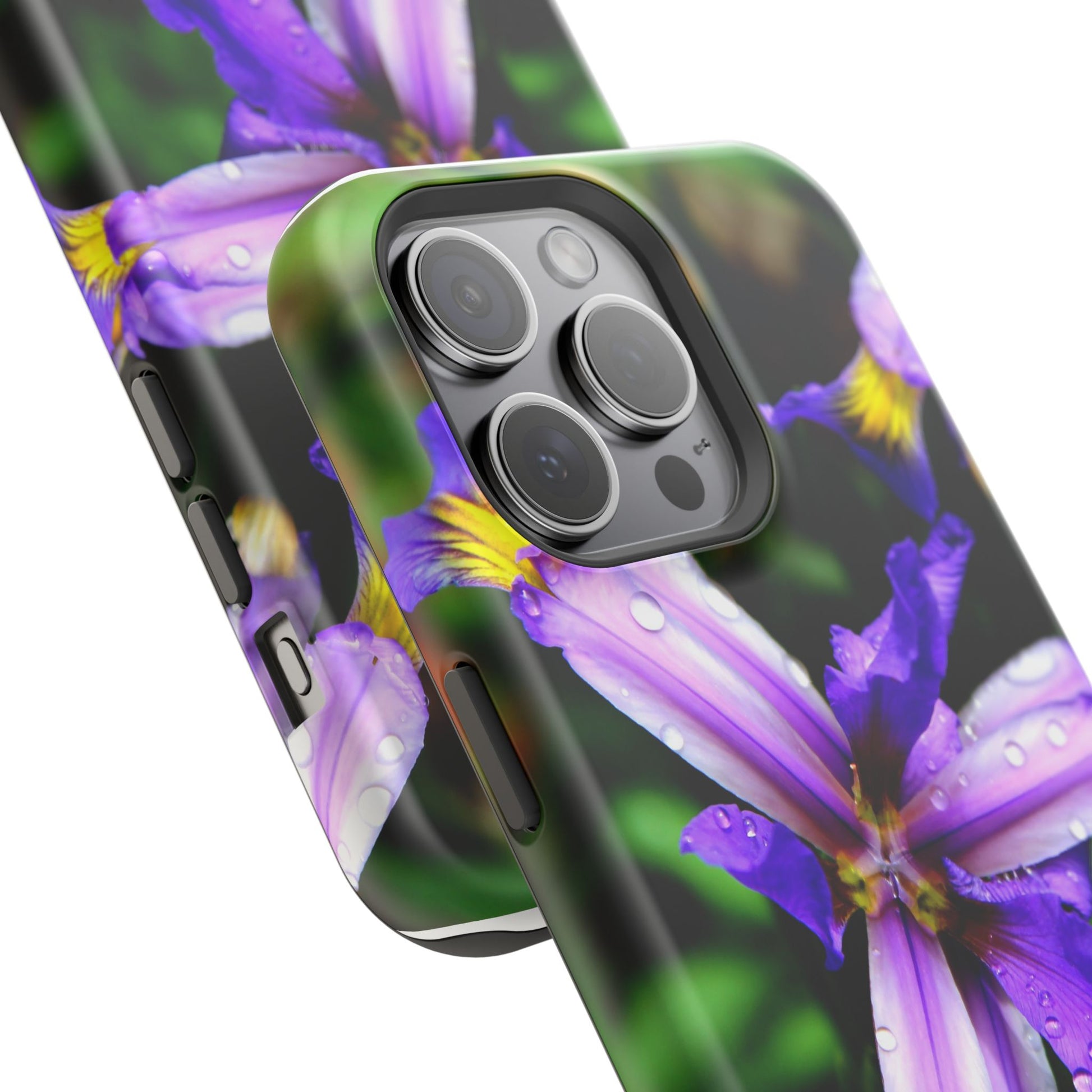 A vibrant floral phone case that brings a small burst of garden calm to your daily routine. The close-up photograph of a purple iris shimmers across the full wrap, with dewdrops and rich greens that feel fresh and alive. It snaps on as a dual-layer shell — a rigid polycarbonate exterior with a cushioned TPU liner — so your phone looks beautiful while staying protected against bumps and scratches. Built-in magnets work with MagSafe® accessories, and you can choose a glossy or matte finish to match your style. Lightweight, durable, and printed in high-resolution so colors stay crisp and true, this case turns a pocket necessity into a little moment of joy.