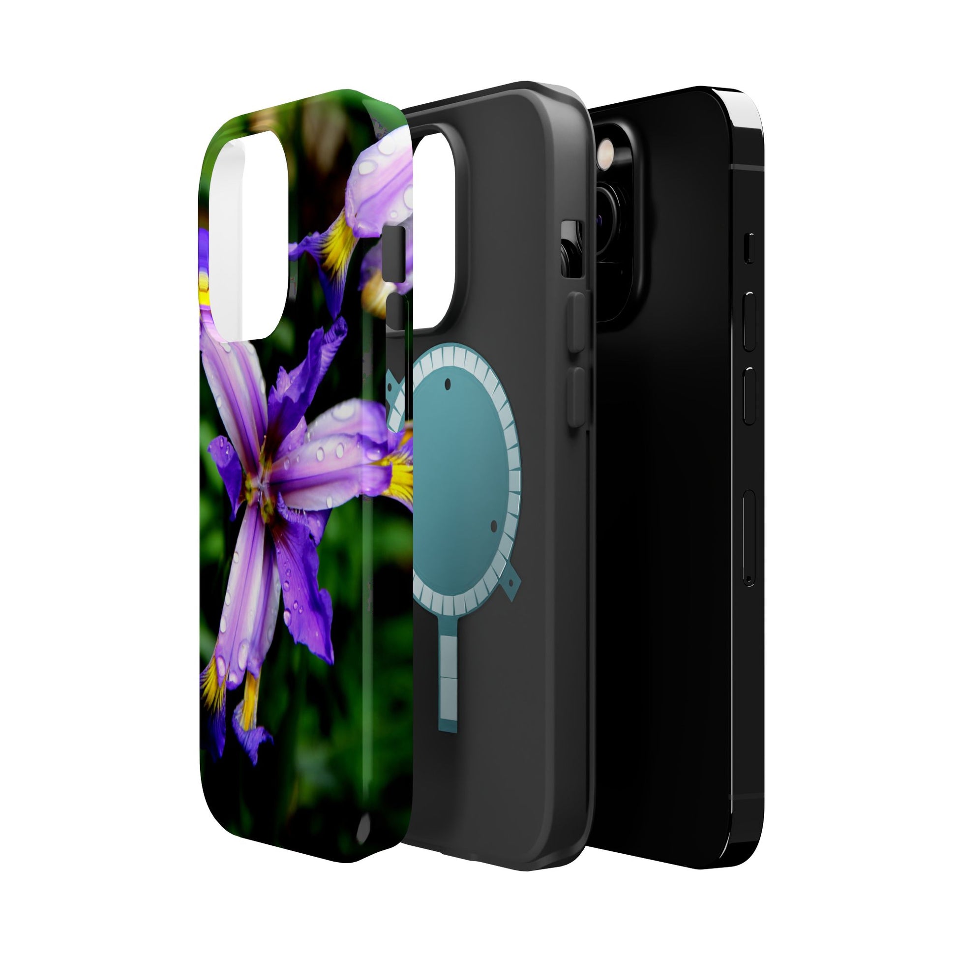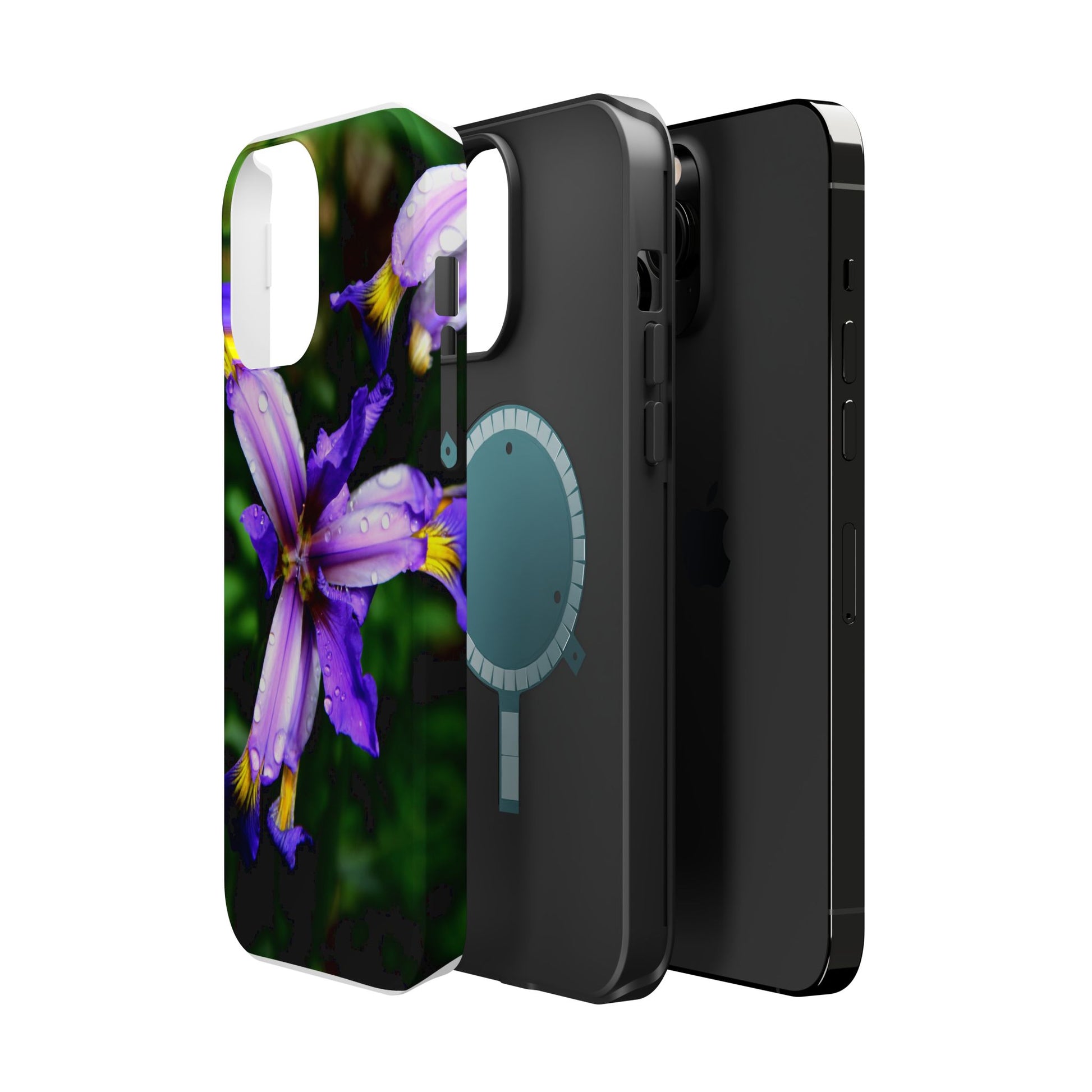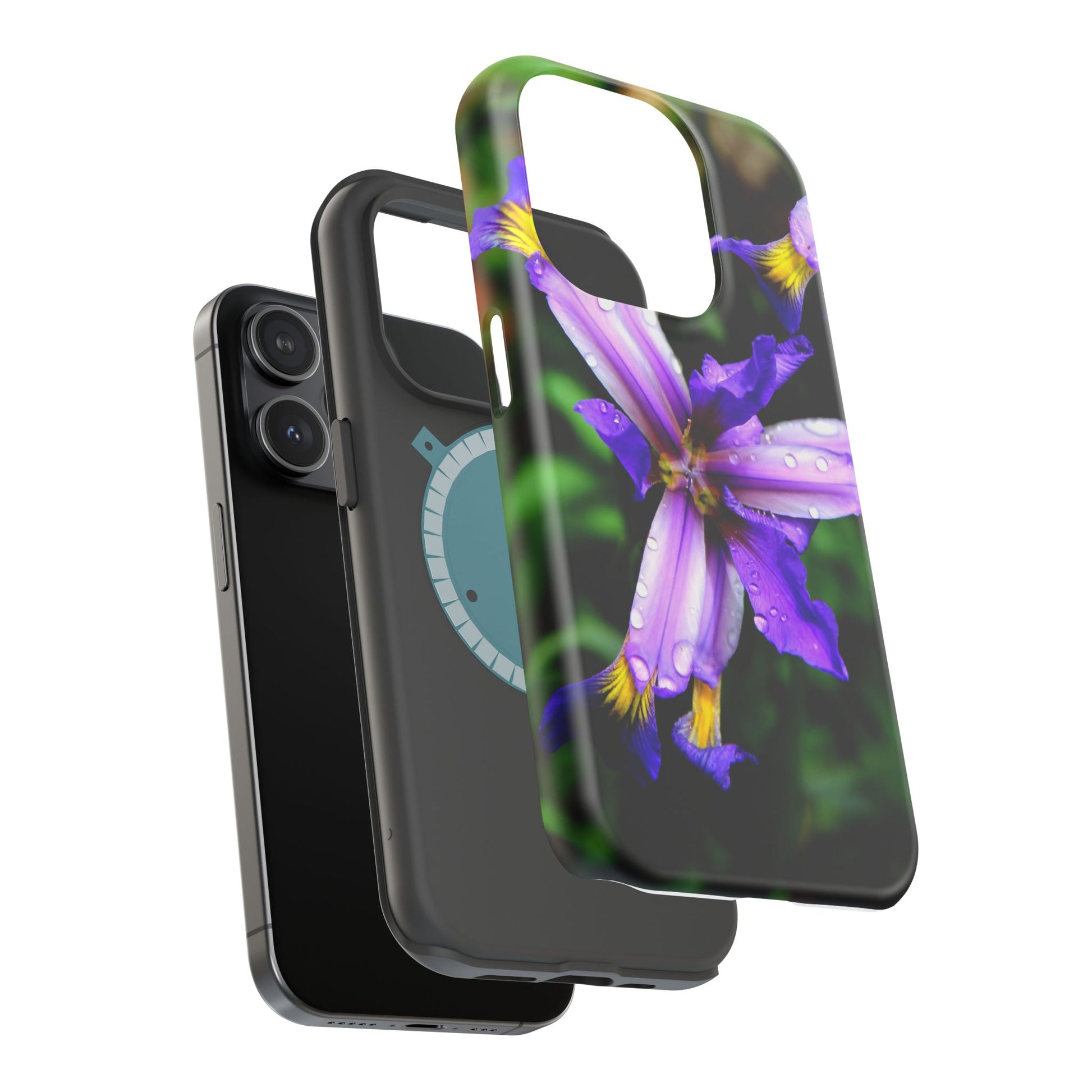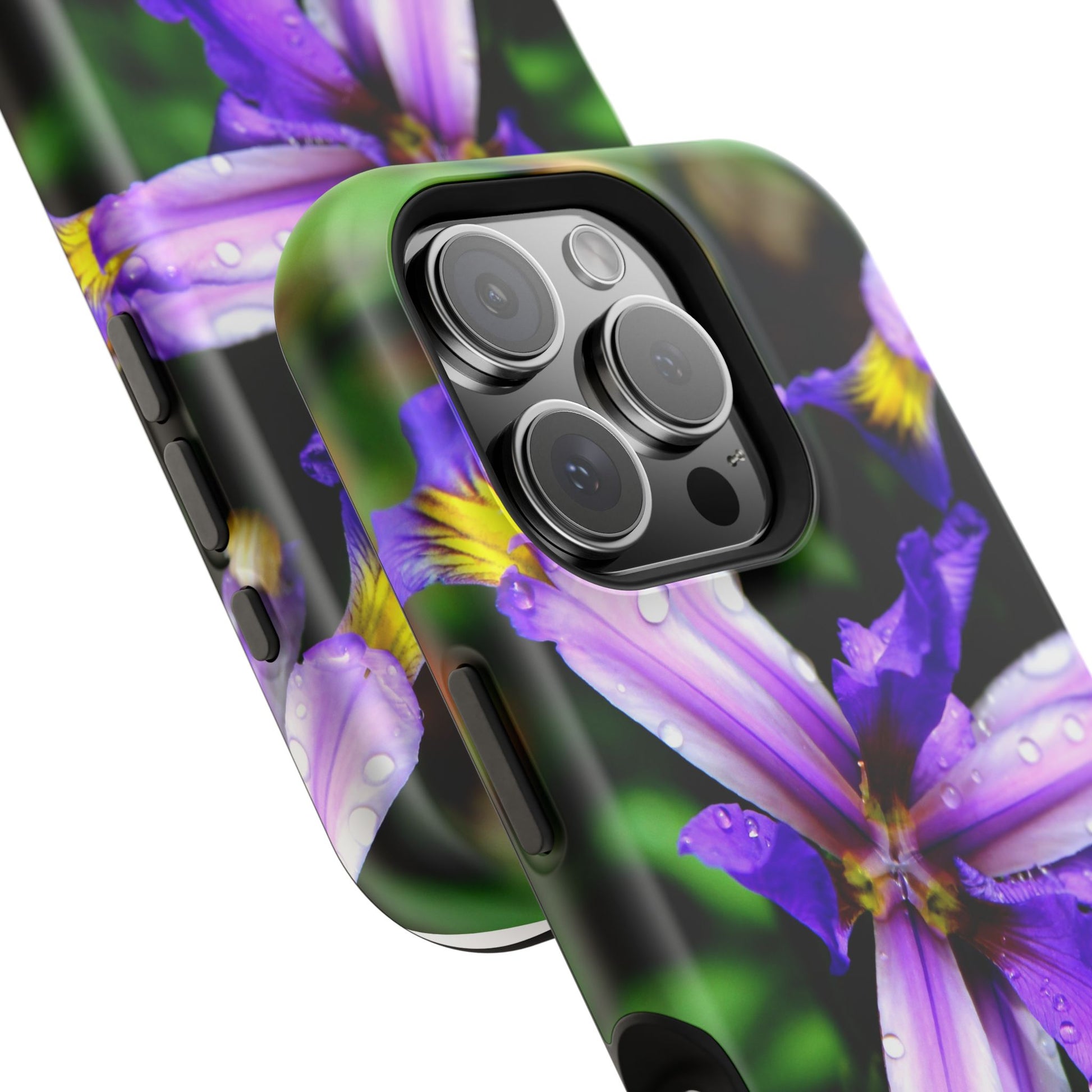 A vibrant floral phone case that brings a small burst of garden calm to your daily routine. The close-up photograph of a purple iris shimmers across the full wrap, with dewdrops and rich greens that feel fresh and alive. It snaps on as a dual-layer shell — a rigid polycarbonate exterior with a cushioned TPU liner — so your phone looks beautiful while staying protected against bumps and scratches. Built-in magnets work with MagSafe® accessories, and you can choose a glossy or matte finish to match your style. Lightweight, durable, and printed in high-resolution so colors stay crisp and true, this case turns a pocket necessity into a little moment of joy.