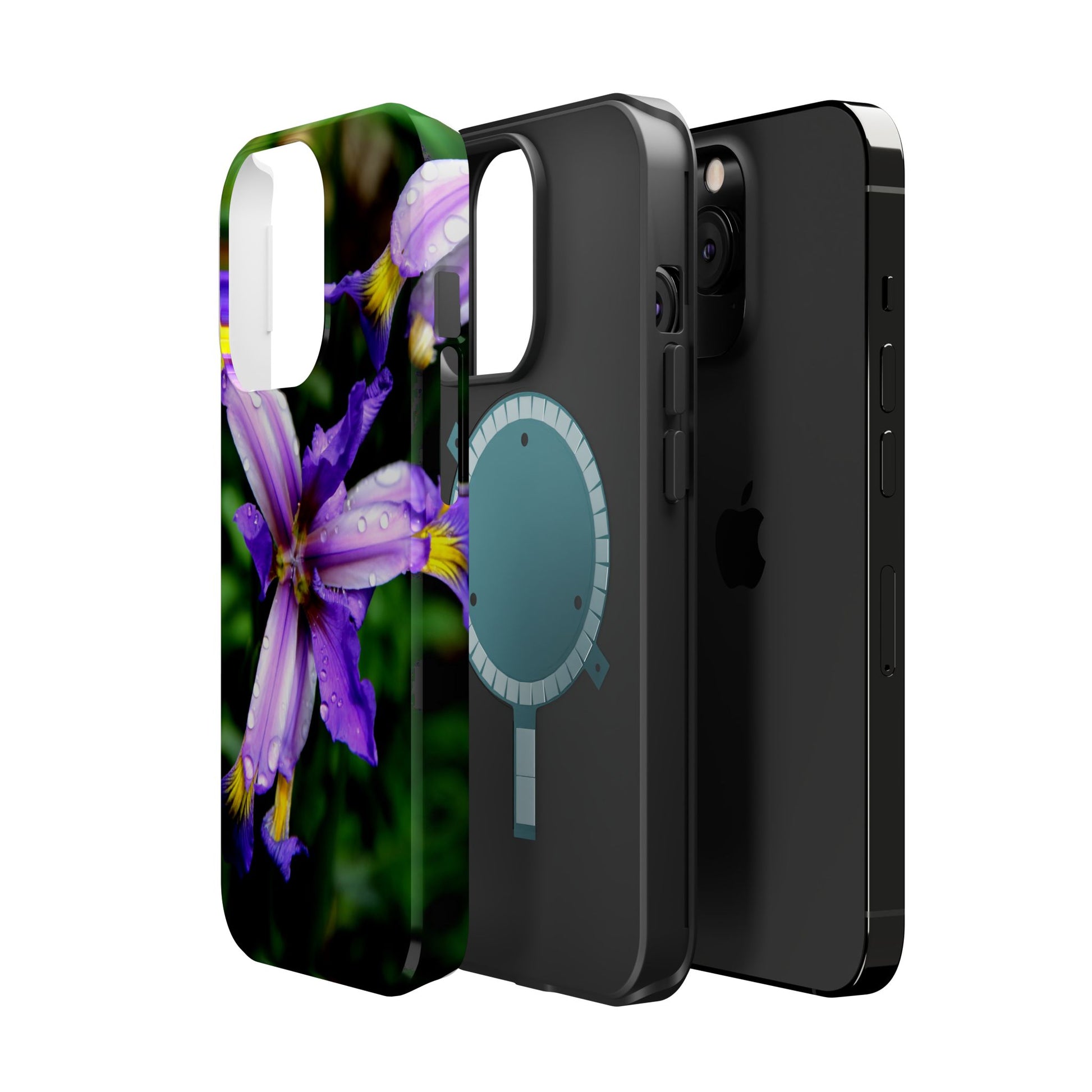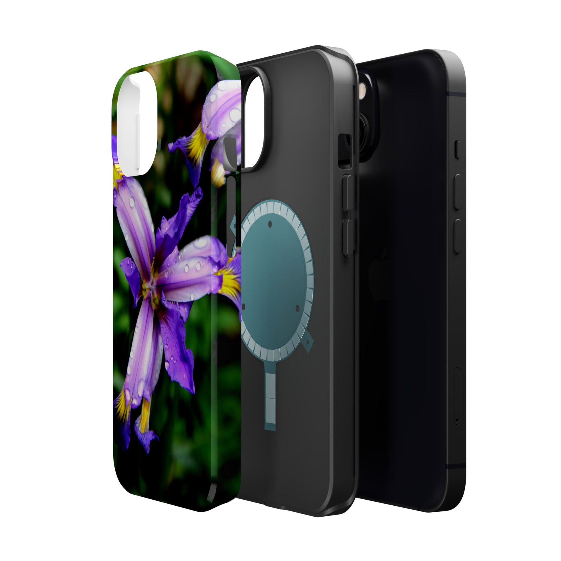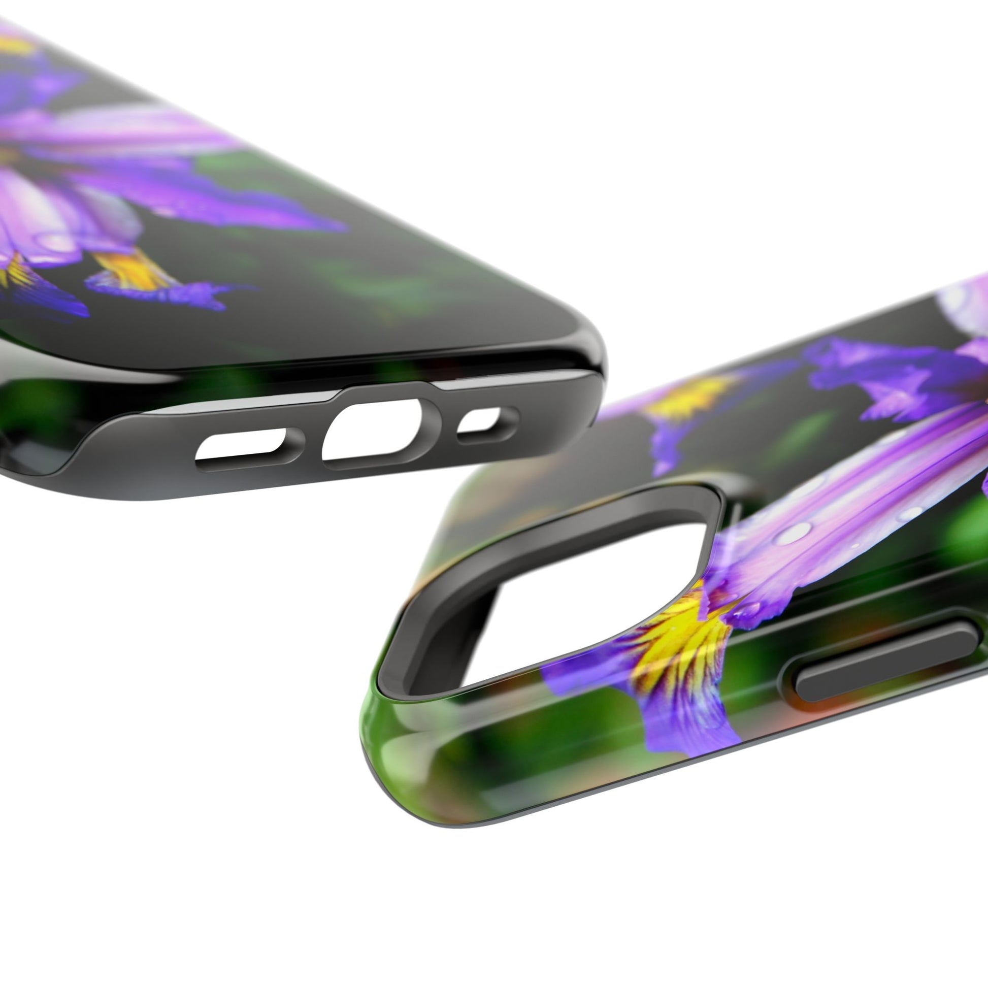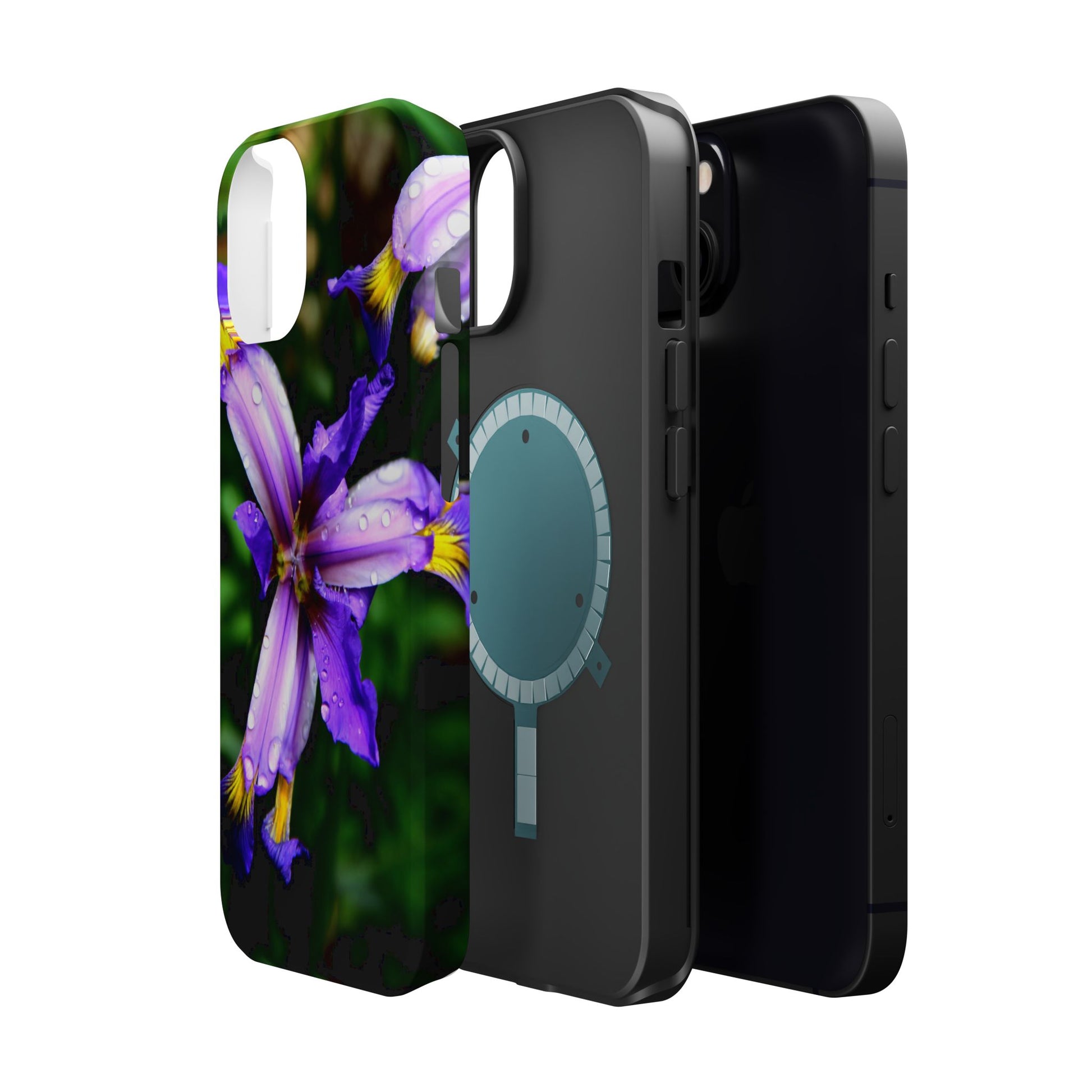 A vibrant floral phone case that brings a small burst of garden calm to your daily routine. The close-up photograph of a purple iris shimmers across the full wrap, with dewdrops and rich greens that feel fresh and alive. It snaps on as a dual-layer shell — a rigid polycarbonate exterior with a cushioned TPU liner — so your phone looks beautiful while staying protected against bumps and scratches. Built-in magnets work with MagSafe® accessories, and you can choose a glossy or matte finish to match your style. Lightweight, durable, and printed in high-resolution so colors stay crisp and true, this case turns a pocket necessity into a little moment of joy.