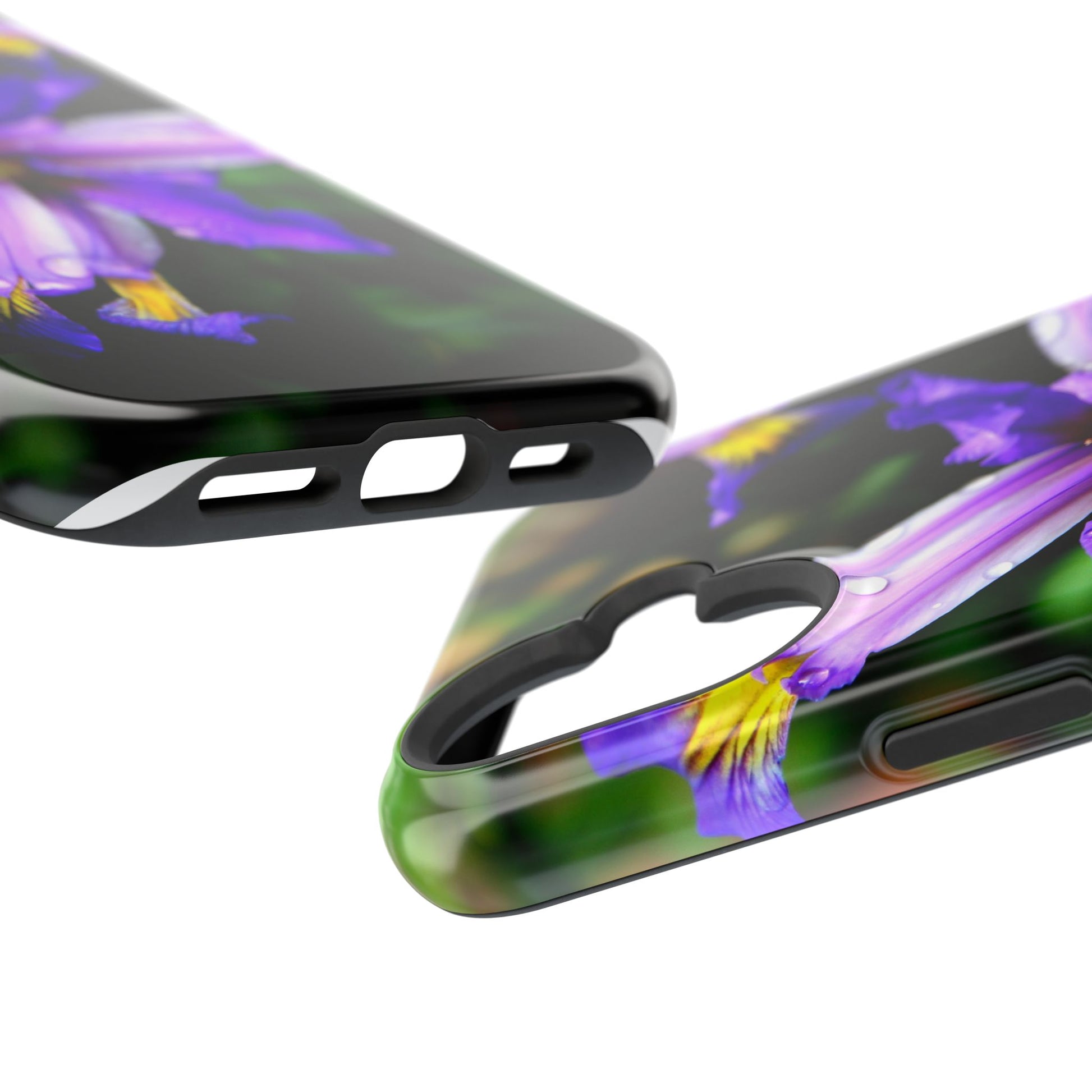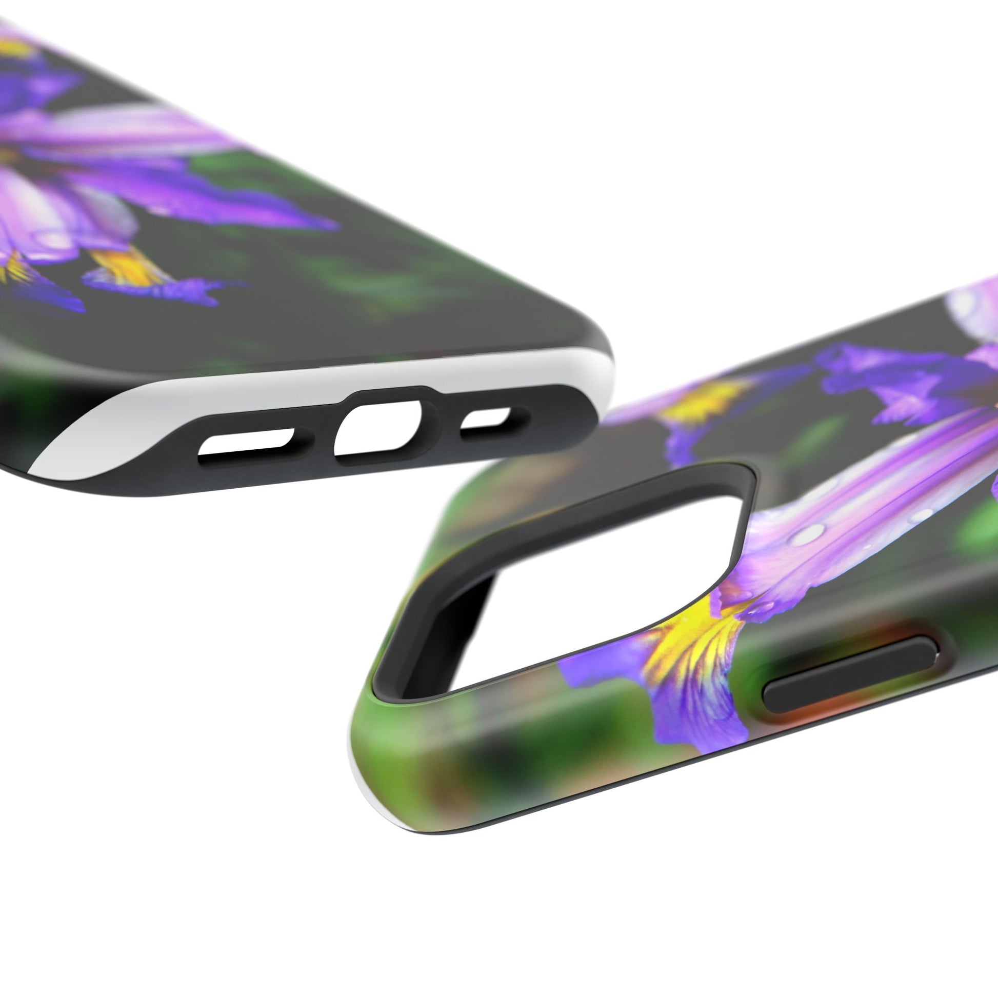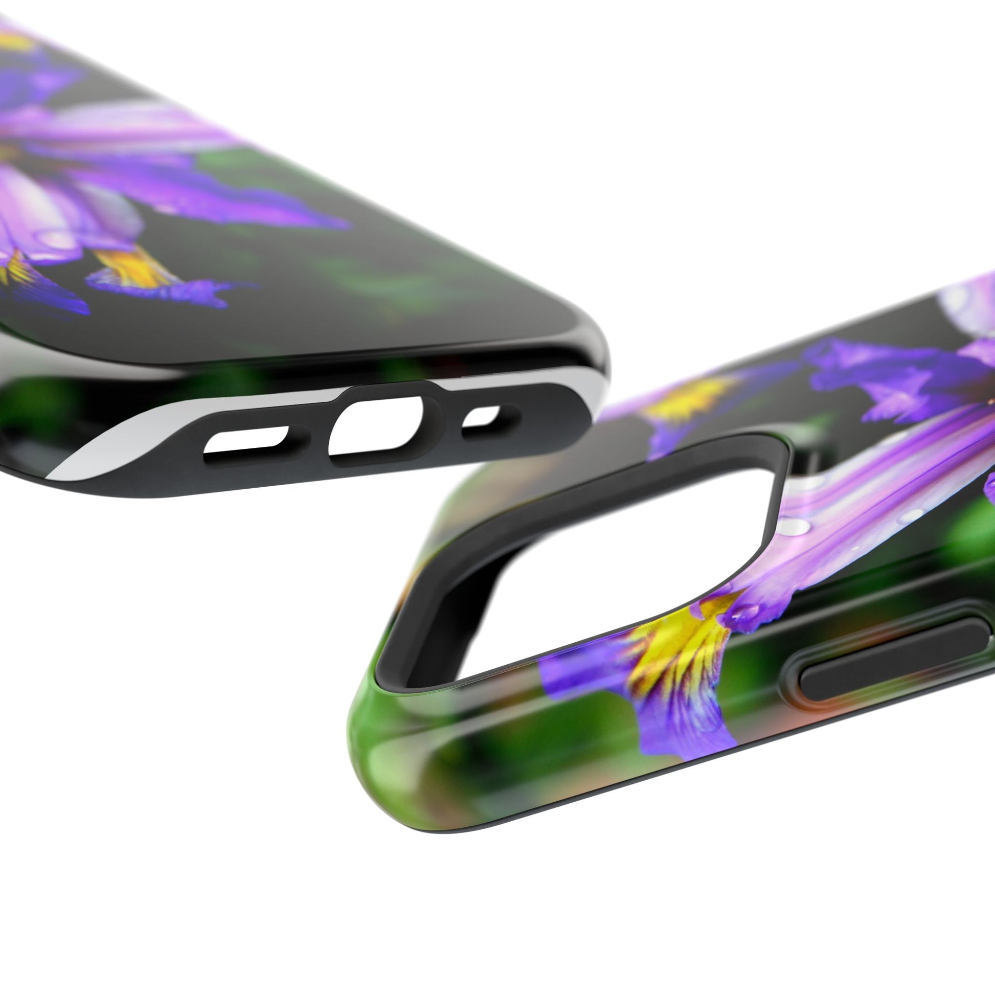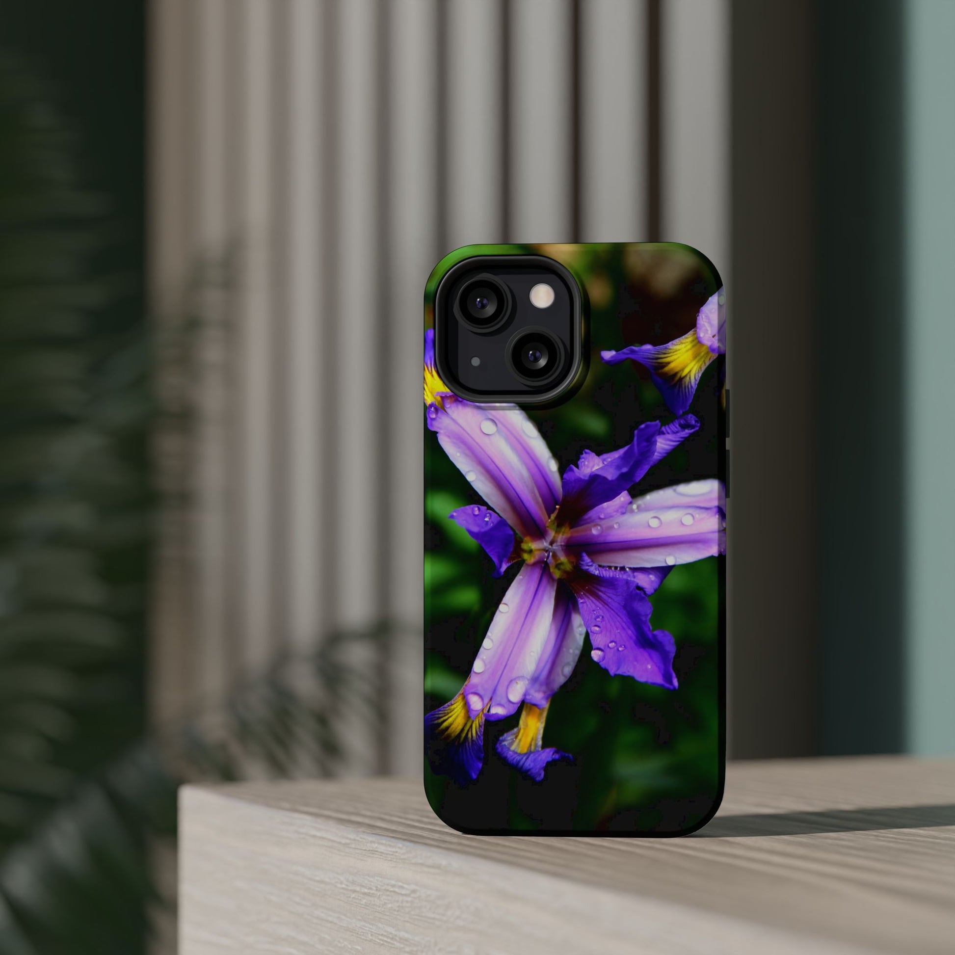 A vibrant floral phone case that brings a small burst of garden calm to your daily routine. The close-up photograph of a purple iris shimmers across the full wrap, with dewdrops and rich greens that feel fresh and alive. It snaps on as a dual-layer shell — a rigid polycarbonate exterior with a cushioned TPU liner — so your phone looks beautiful while staying protected against bumps and scratches. Built-in magnets work with MagSafe® accessories, and you can choose a glossy or matte finish to match your style. Lightweight, durable, and printed in high-resolution so colors stay crisp and true, this case turns a pocket necessity into a little moment of joy.
