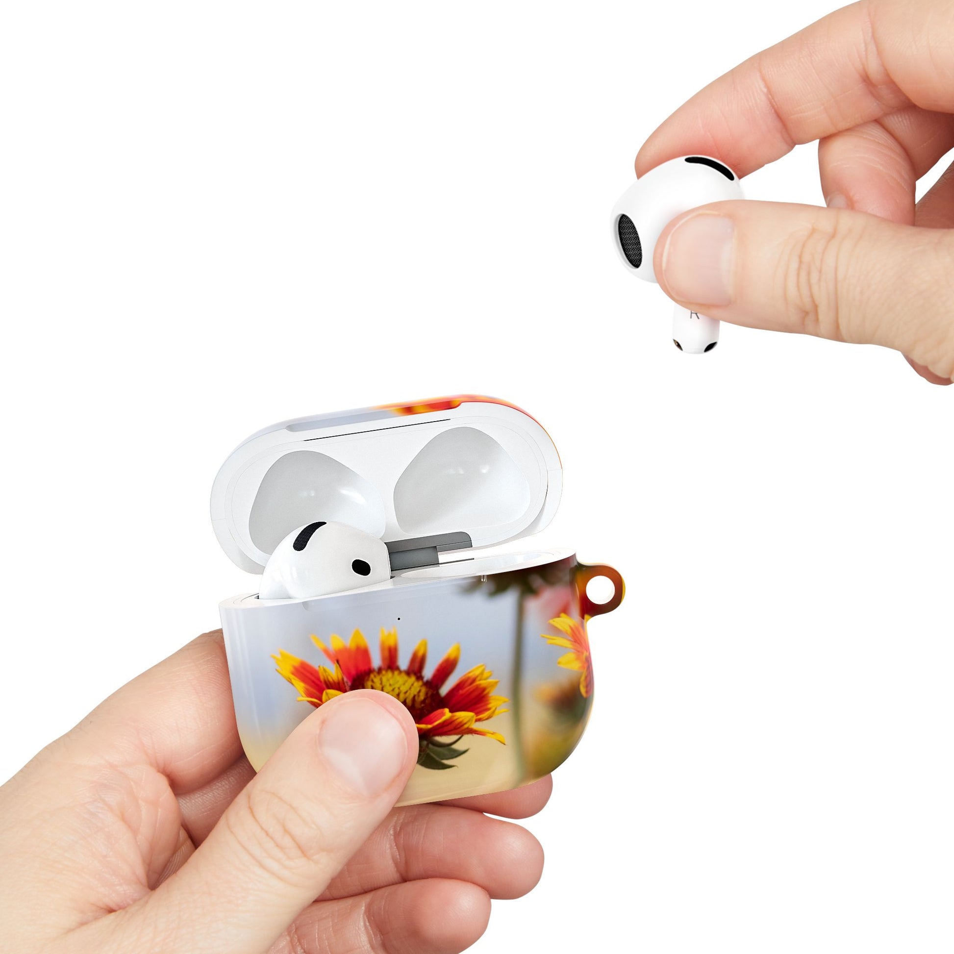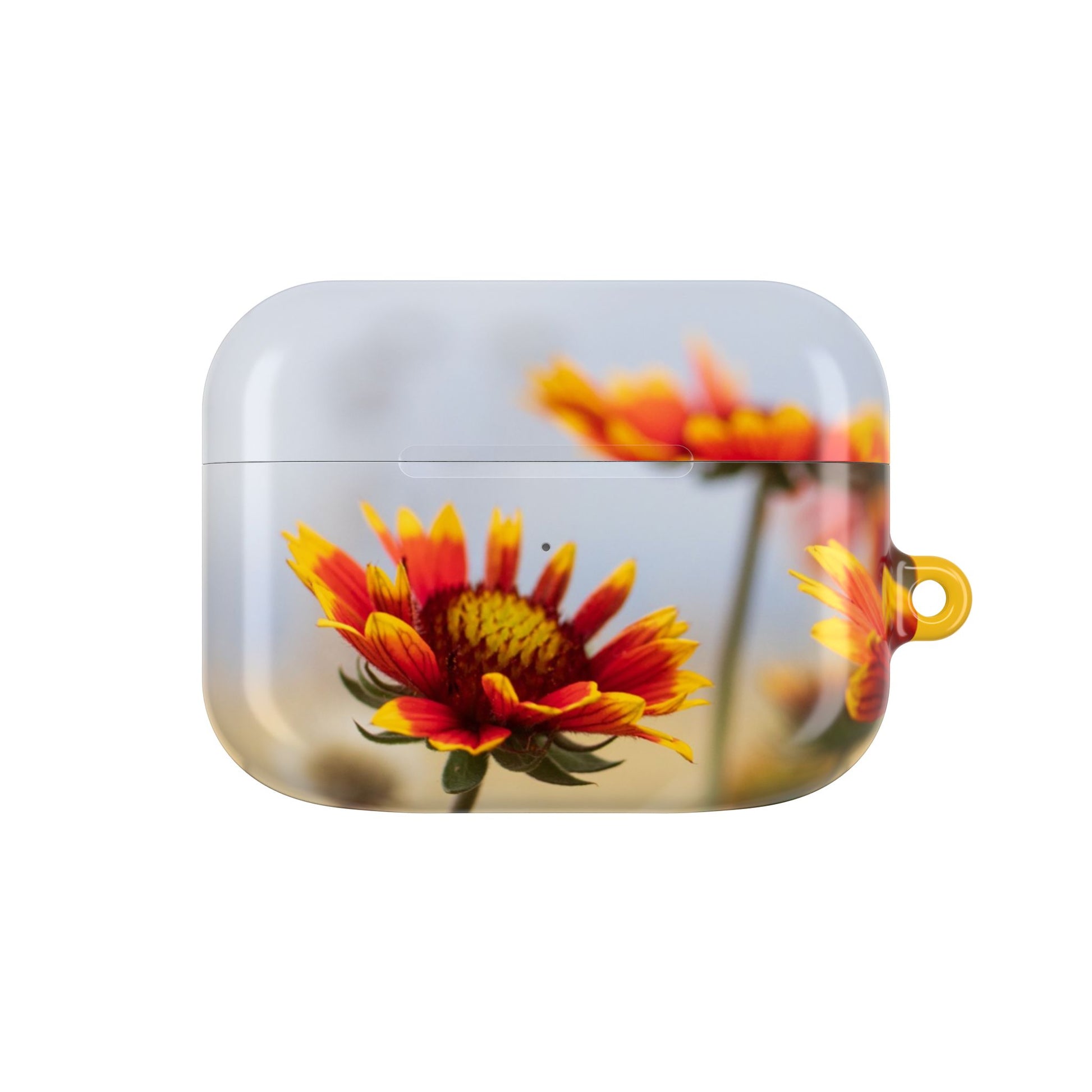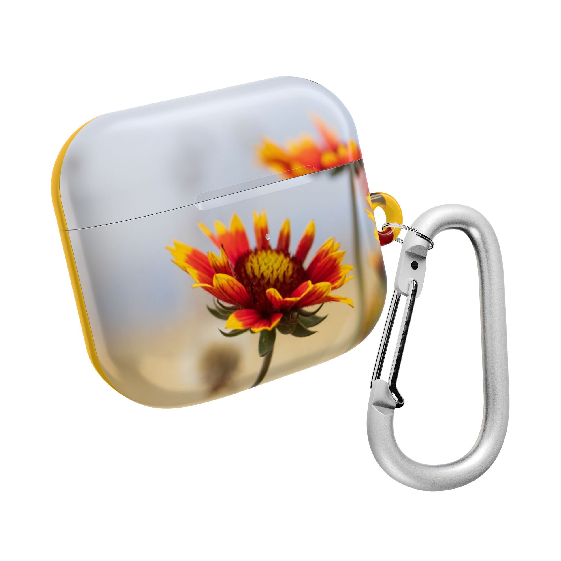 A slim, glossy polycarbonate AirPod case that pairs durable protection with sunlit floral style. The lightweight shell guards against shocks and scratches while leaving the charging port accessible — including Qi wireless charging — and comes with a handy carabiner for clipping to bags or belts. The vivid sunflower-inspired print wraps the case in warm yellows and soft focus blooms, bringing a bright, everyday flourish to commutes, walks, and crowded cafés. Made in South Korea and finished with a high-gloss coat, it feels smooth in hand and stands up to daily wear without adding bulk.