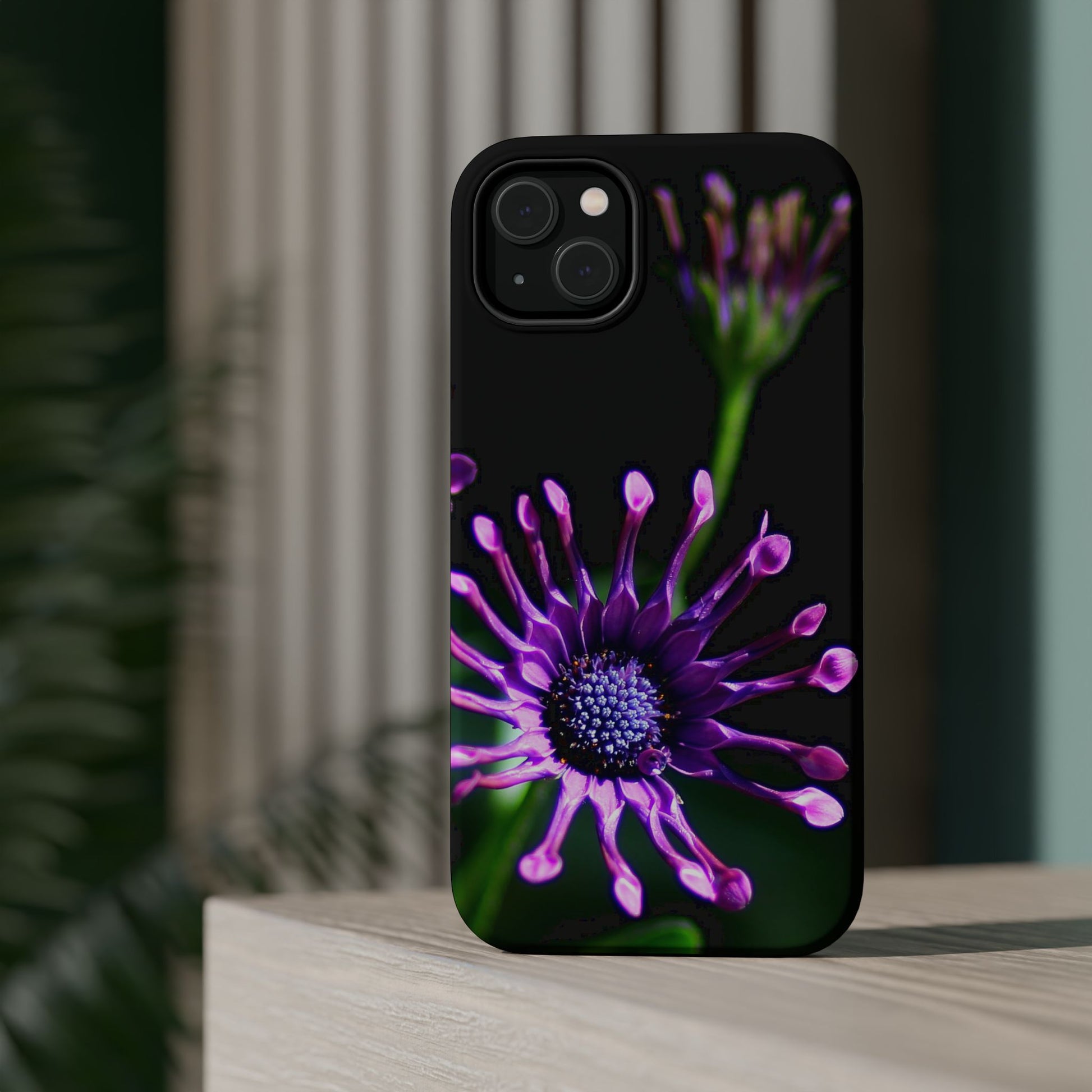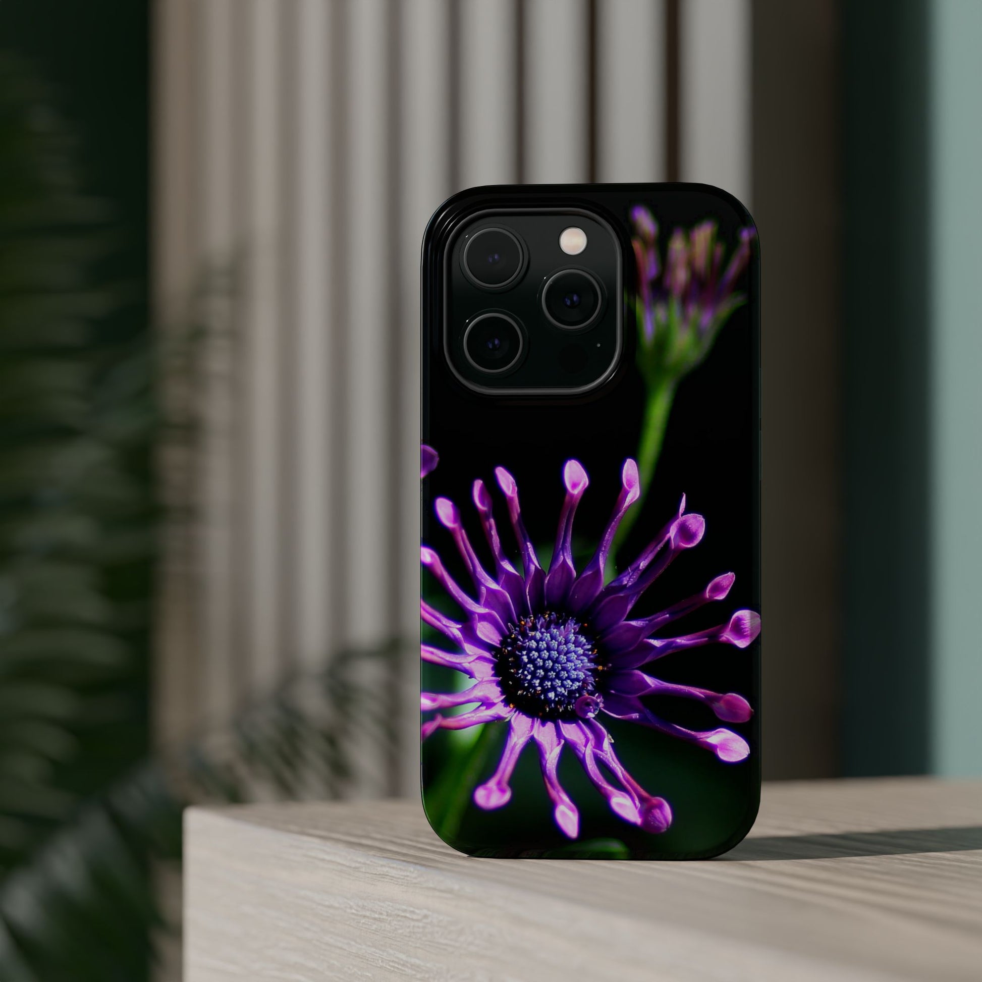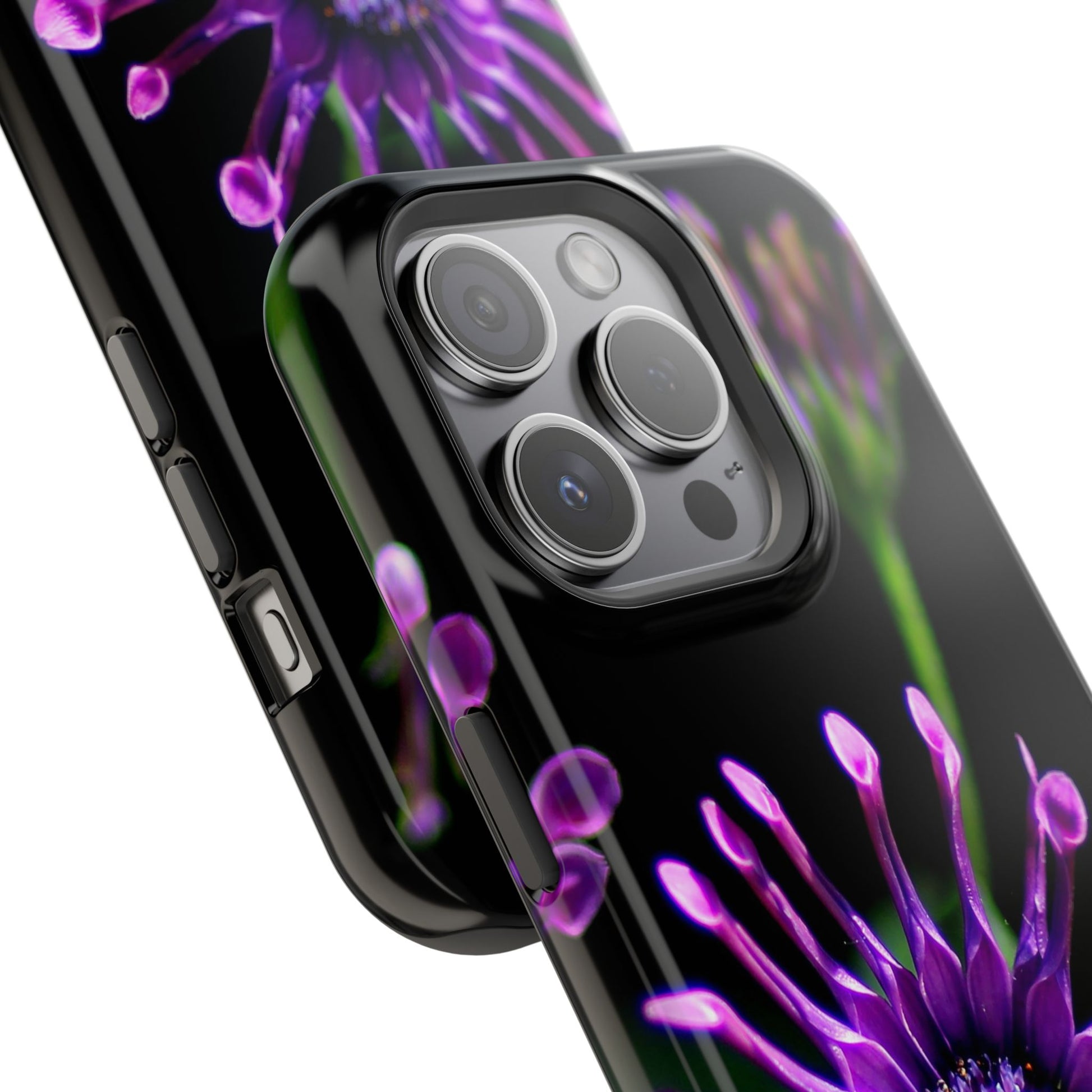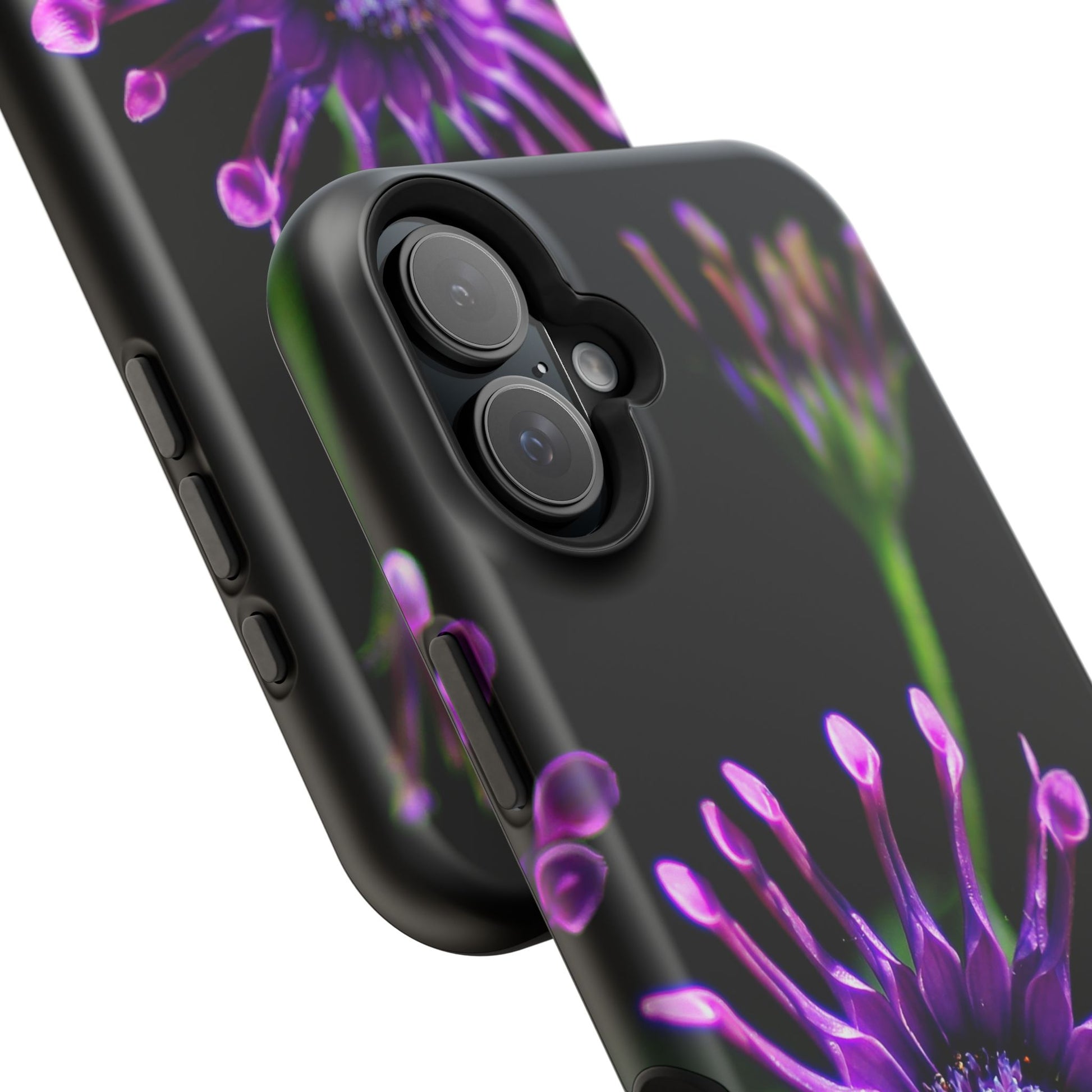 This impact-resistant phone case wraps your device in bold, photo-realistic floral art and rugged dual-layer protection. The glossy/matte full-wrap print shows a vibrant purple bloom against a deep black backdrop, creating a dramatic, high-contrast look that reads like a miniature piece of photography. Inside, a cushioned TPU liner absorbs shocks while the rigid polycarbonate shell resists scratches and everyday wear. Built-in magnets maintain MagSafe® compatibility so you can attach chargers or accessories without removing the case. Slim but sturdy, it keeps your phone ready for daily adventures—and looks striking wherever you set it down.