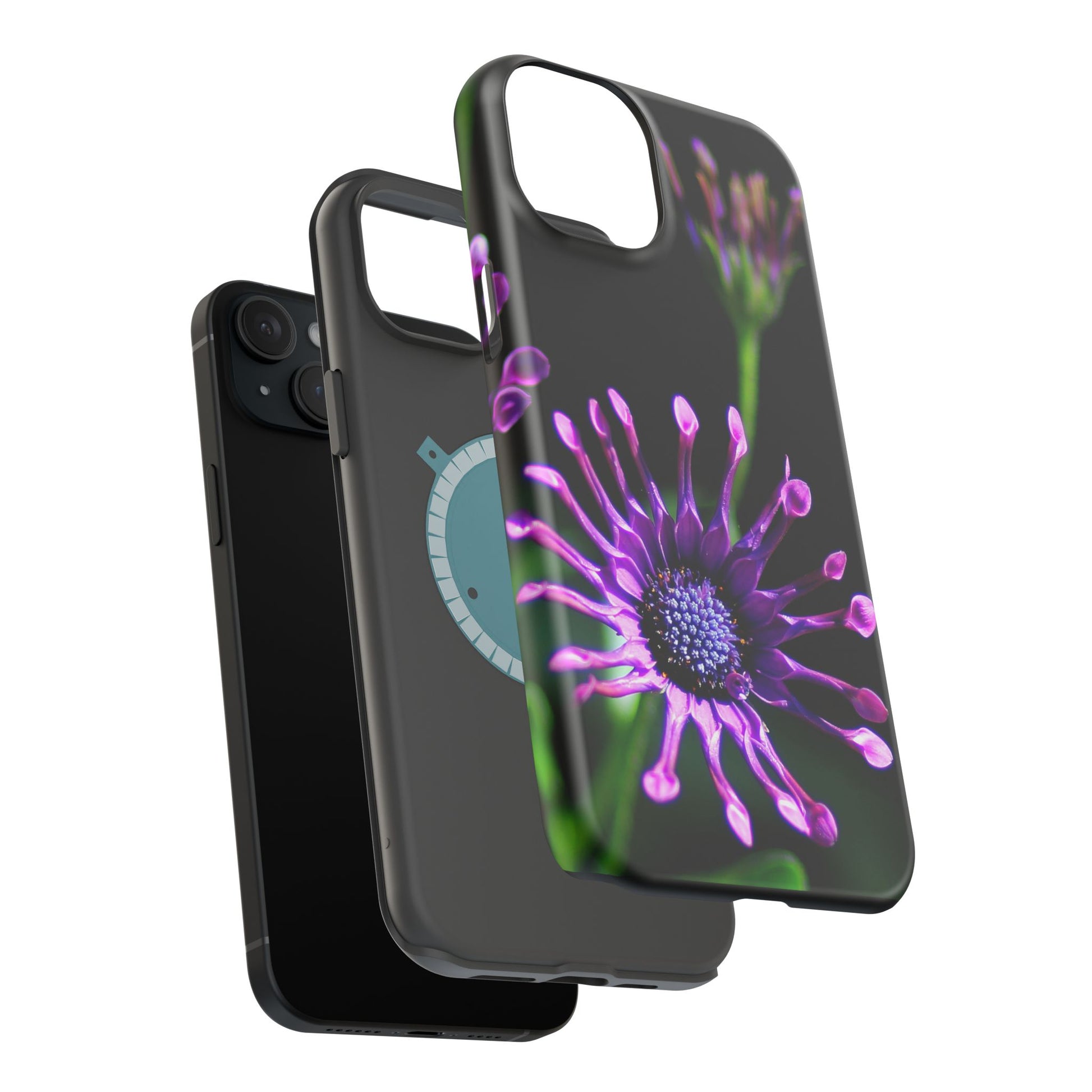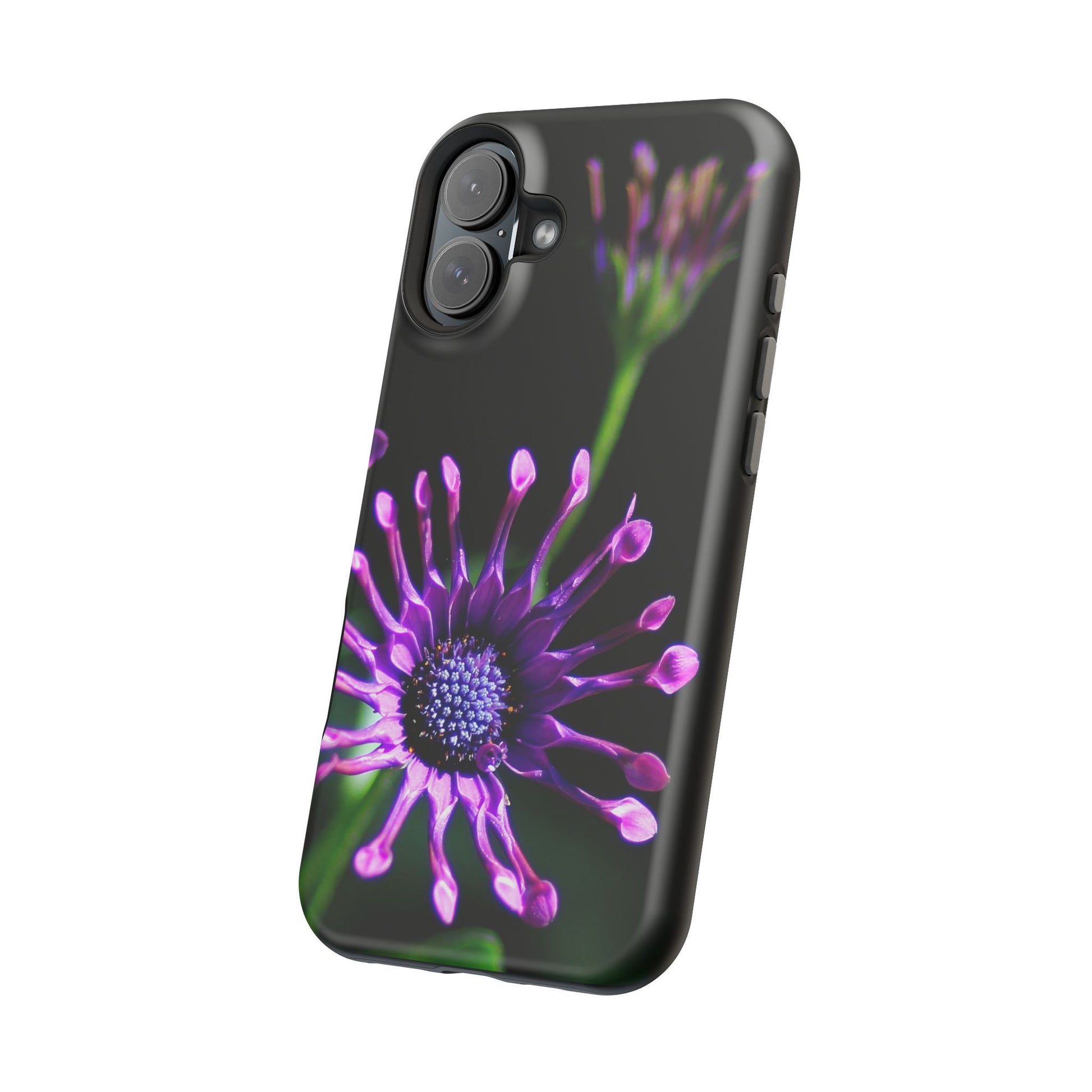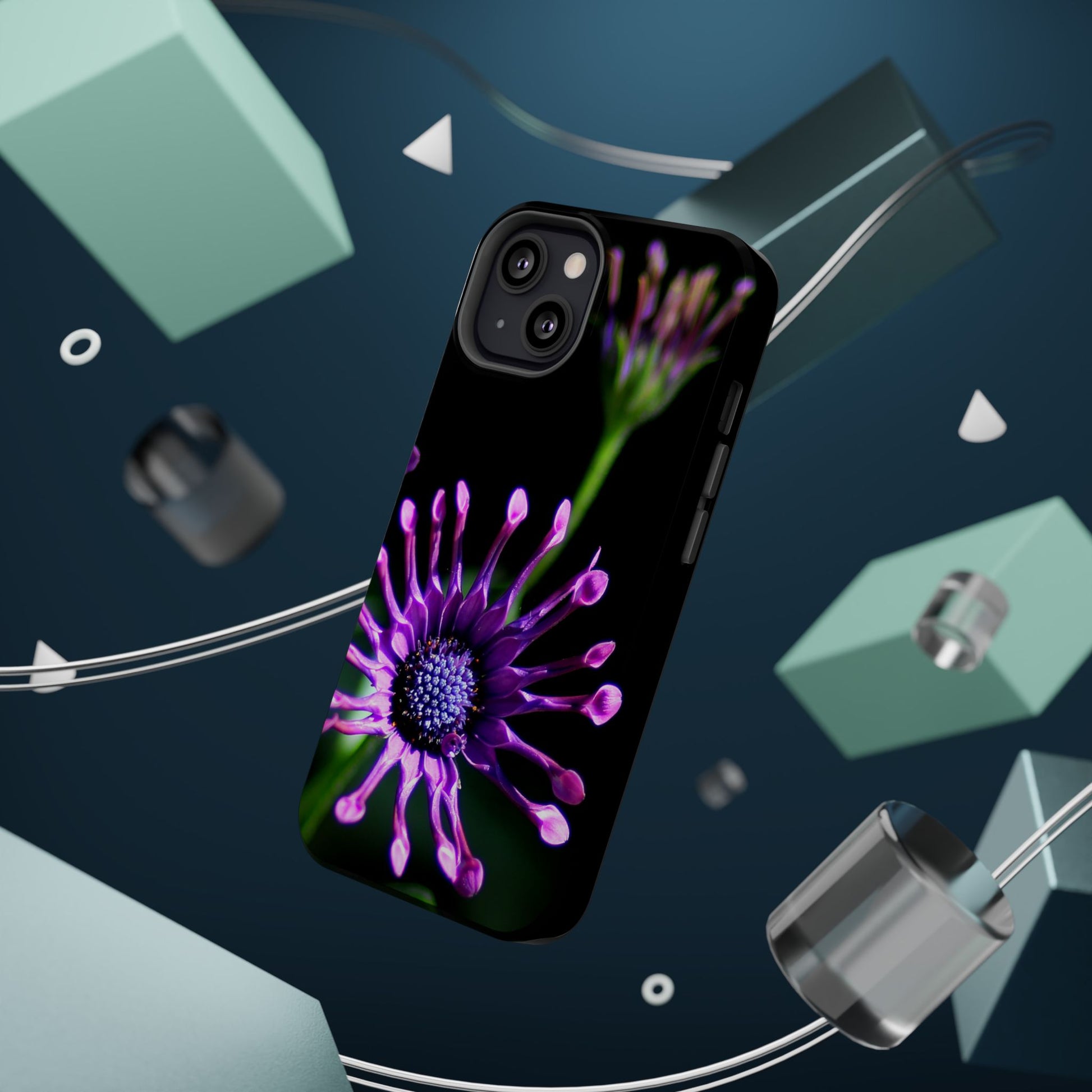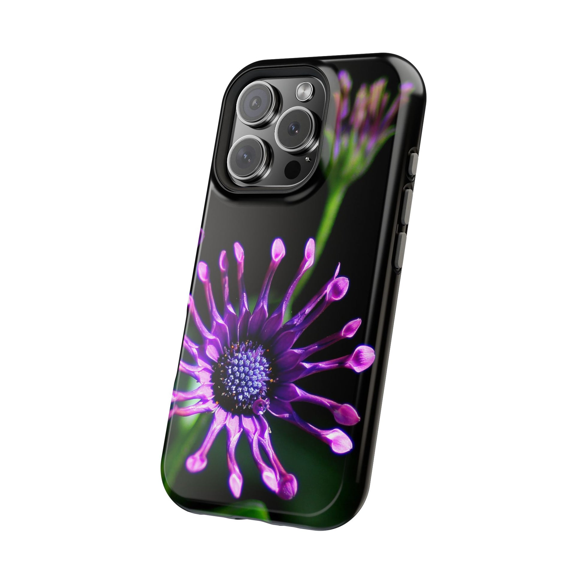 This impact-resistant phone case wraps your device in bold, photo-realistic floral art and rugged dual-layer protection. The glossy/matte full-wrap print shows a vibrant purple bloom against a deep black backdrop, creating a dramatic, high-contrast look that reads like a miniature piece of photography. Inside, a cushioned TPU liner absorbs shocks while the rigid polycarbonate shell resists scratches and everyday wear. Built-in magnets maintain MagSafe® compatibility so you can attach chargers or accessories without removing the case. Slim but sturdy, it keeps your phone ready for daily adventures—and looks striking wherever you set it down.