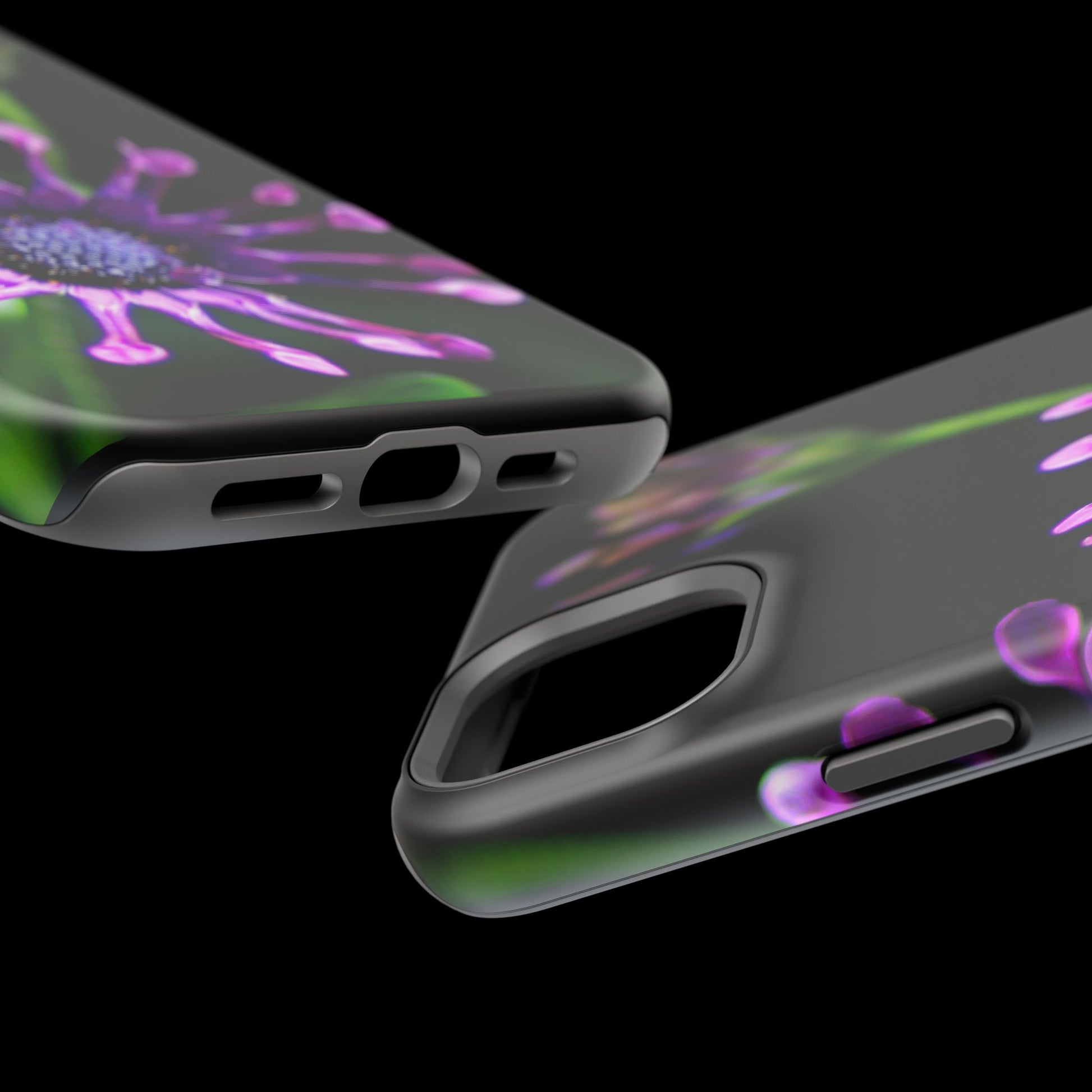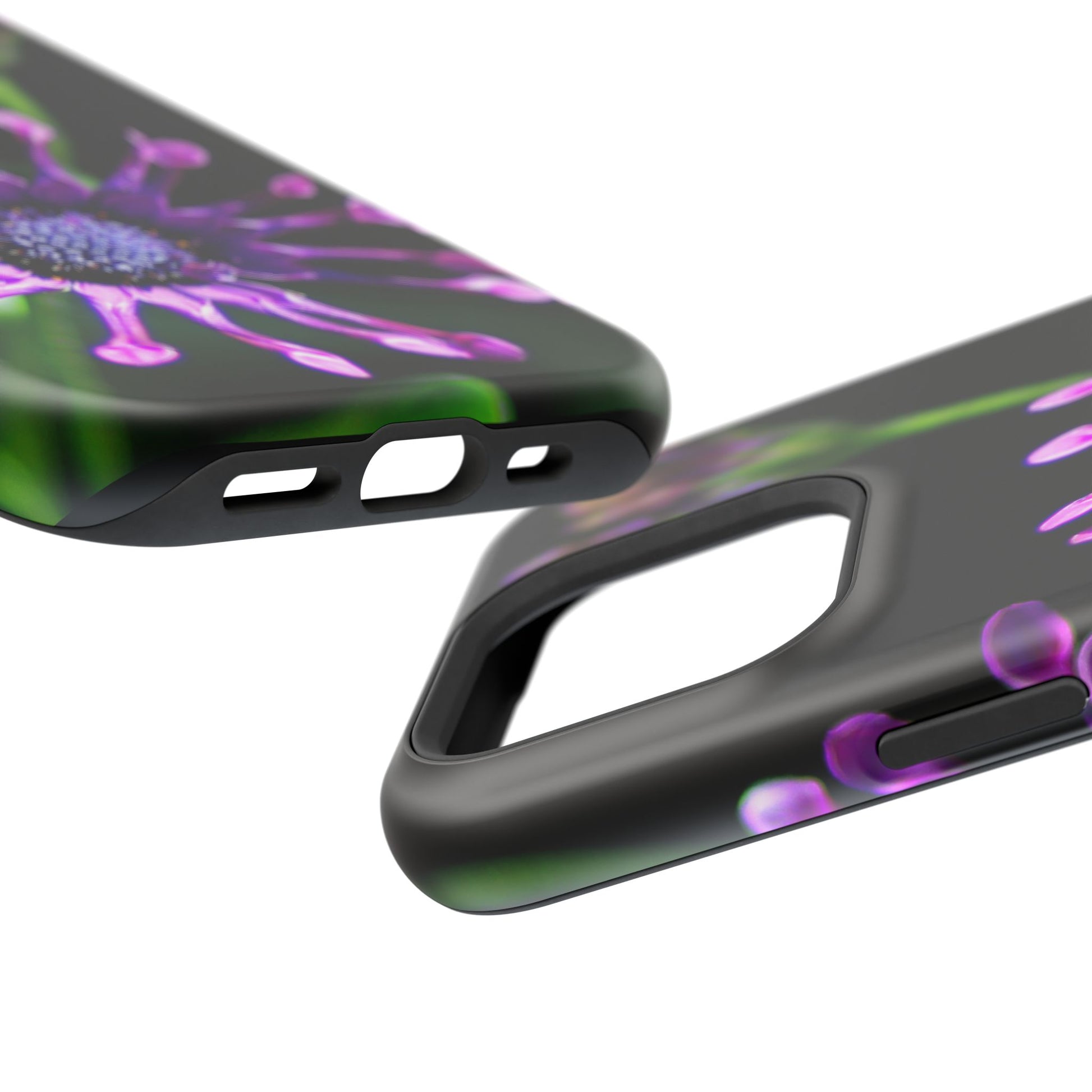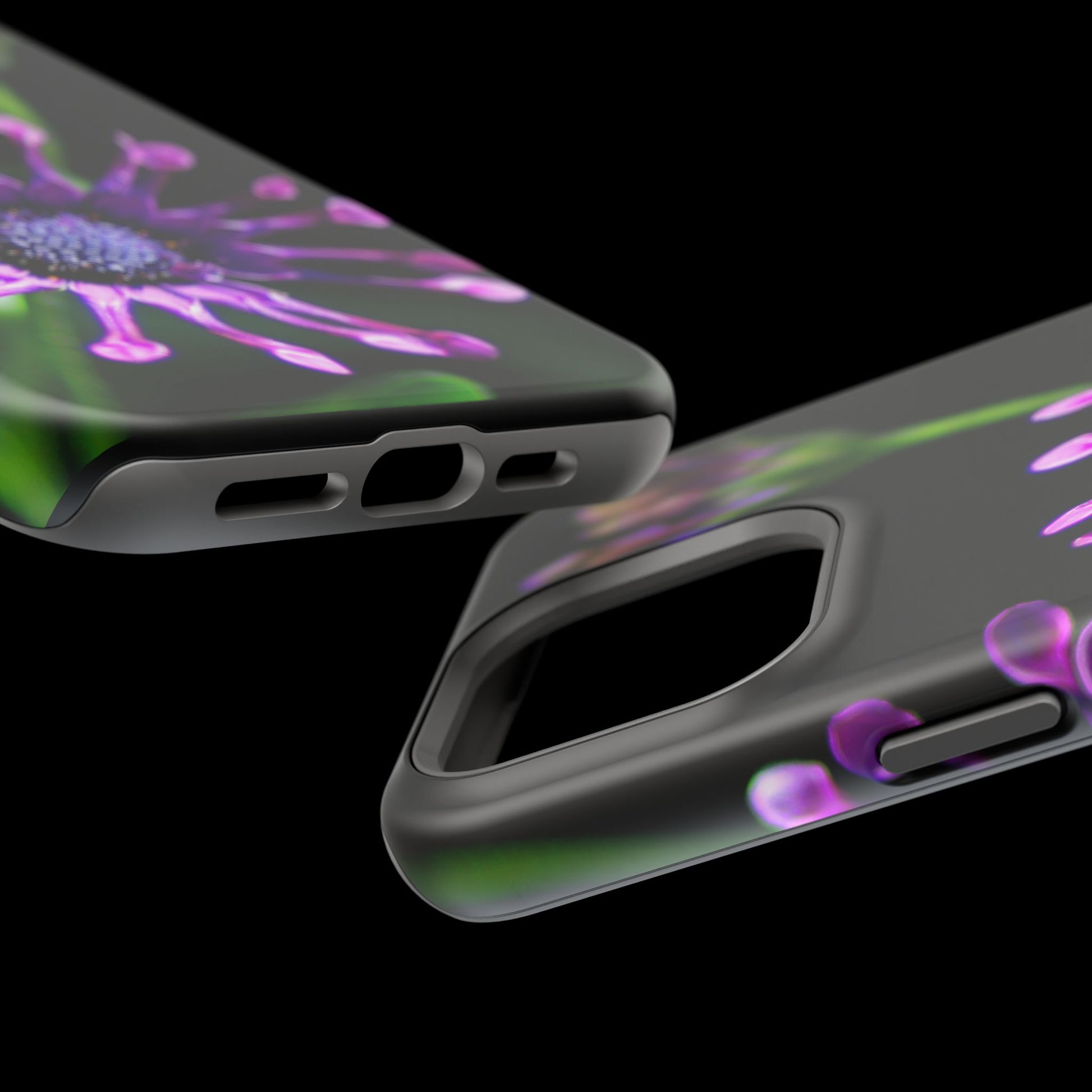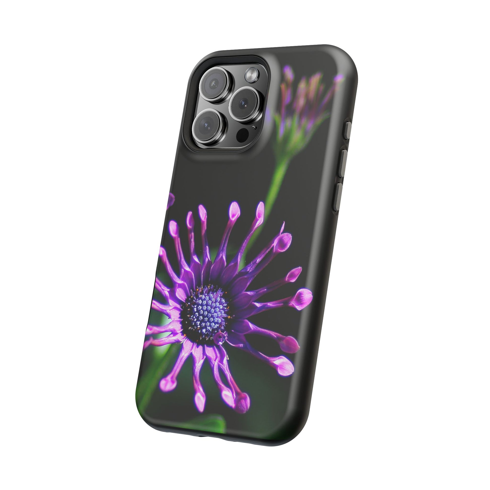 This impact-resistant phone case wraps your device in bold, photo-realistic floral art and rugged dual-layer protection. The glossy/matte full-wrap print shows a vibrant purple bloom against a deep black backdrop, creating a dramatic, high-contrast look that reads like a miniature piece of photography. Inside, a cushioned TPU liner absorbs shocks while the rigid polycarbonate shell resists scratches and everyday wear. Built-in magnets maintain MagSafe® compatibility so you can attach chargers or accessories without removing the case. Slim but sturdy, it keeps your phone ready for daily adventures—and looks striking wherever you set it down.