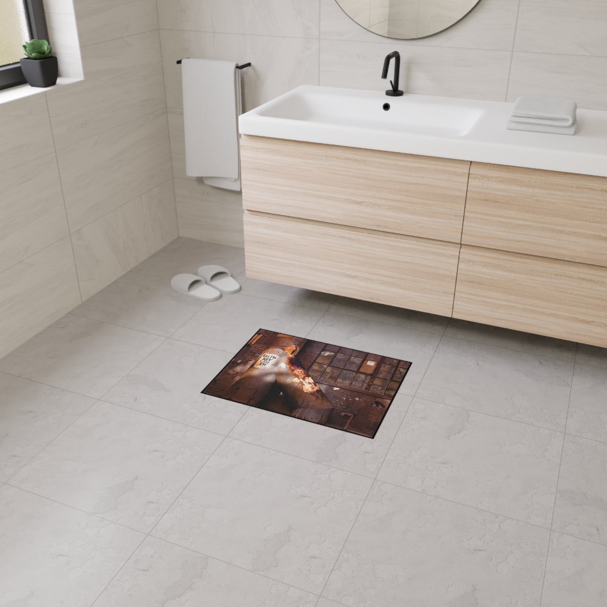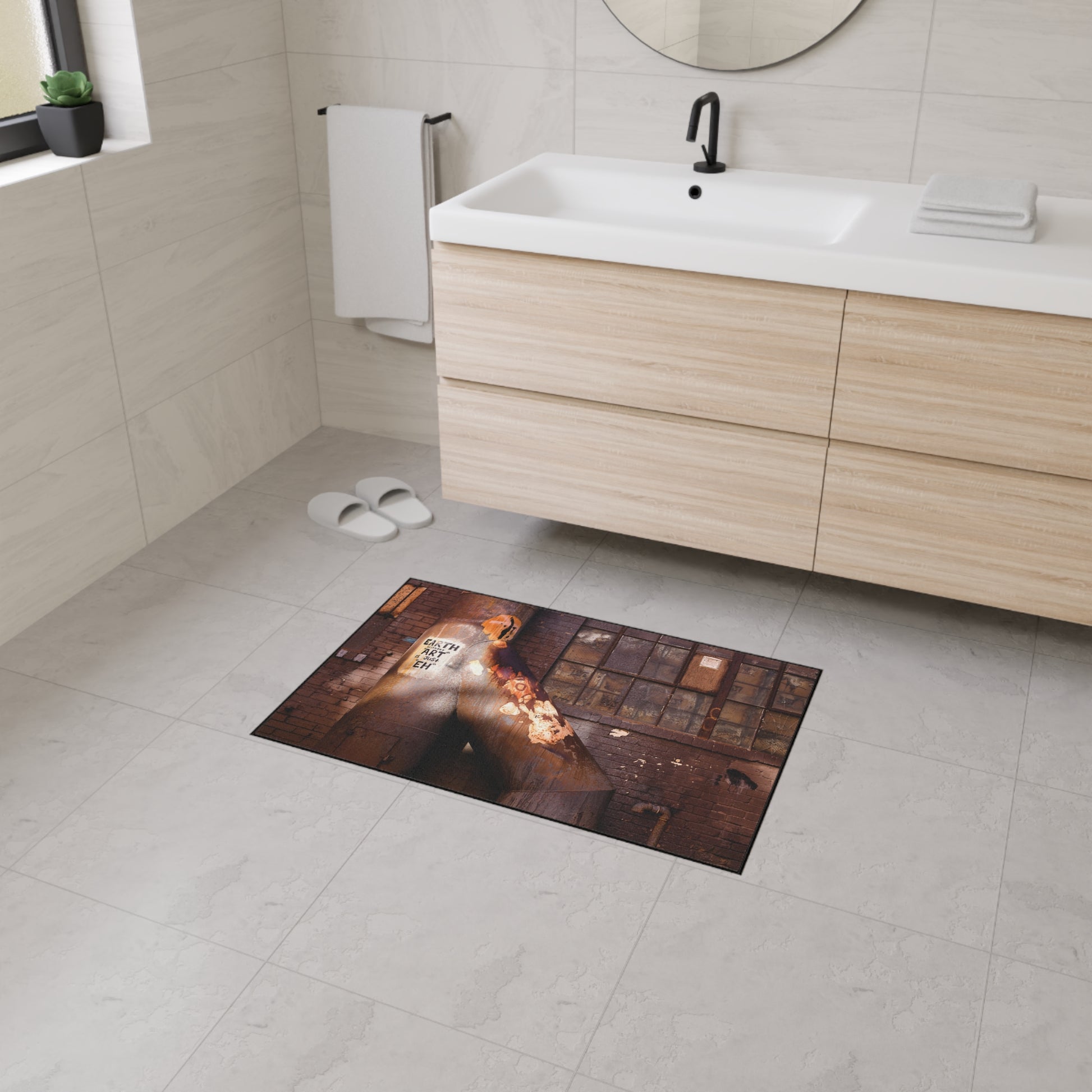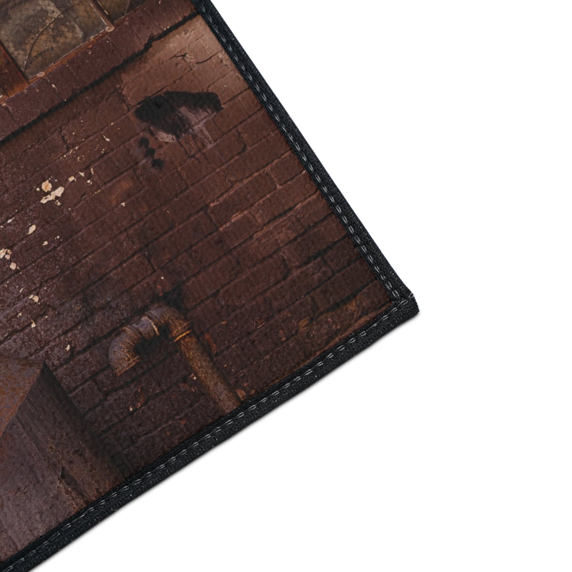 This heavy-duty floor mat carries the grit and warmth of an industrial loft straight into your entryway or studio. The one-sided print captures rusted pipes, weathered brick, and layered street art in saturated tones that hold up wash after wash. A polyester face keeps the image crisp and vibrant, while the rubber-backed, anti-slip underside anchors the mat on tile, wood, or concrete. The black trim frames the scene with a subtle, polished edge. Built to take traffic and tell a story, it feels at home under boots, by workbenches, or inside creative spaces that celebrate patina and urban texture.
